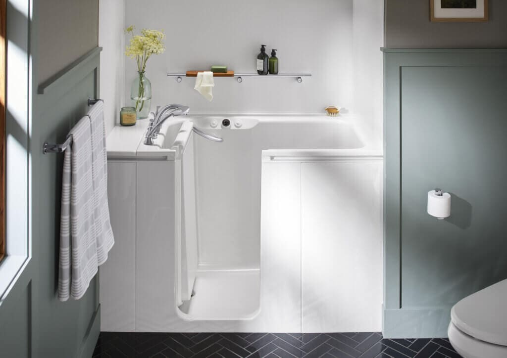 At Renuity, we install KOHLER walk‑in baths crafted with a reinforced composite shell and a glossy, easy‑clean finish designed for lasting comfort.