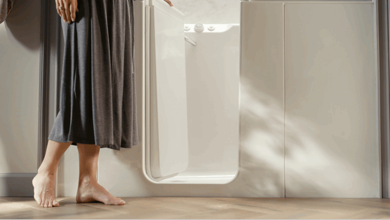 At Renuity, we install KOHLER walk‑in baths crafted with a reinforced composite shell and a glossy, easy‑clean finish designed for lasting comfort.