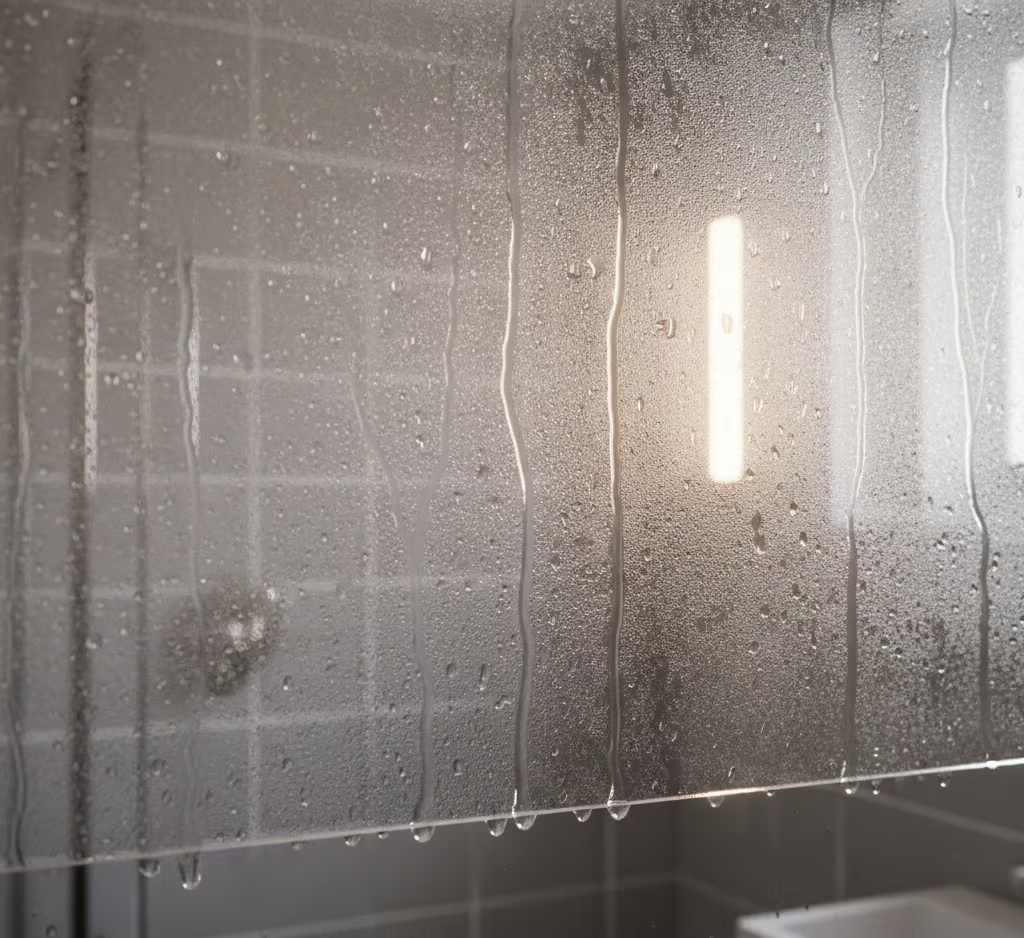 Condensation occurs when warm, moisture-heavy air contacts cooler surfaces. A hot shower releases steam into the room, and that vapor settles into droplets on mirrors, walls, tile, and the outer surfaces surrounding the bathing area. Limited ventilation and persistent humidity intensify the buildup.